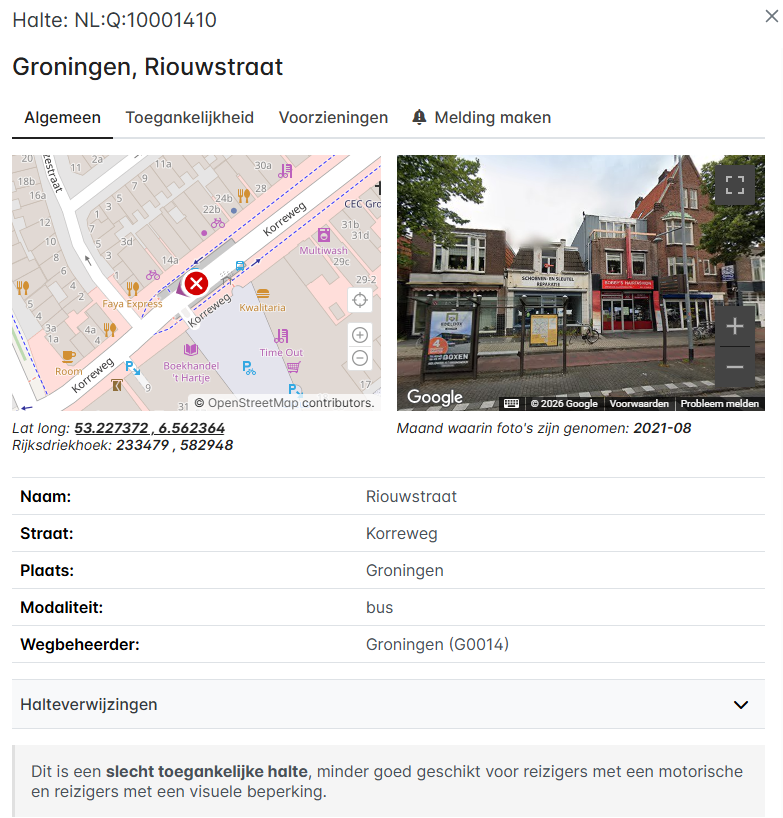 Hier wordt aangegeven dat de halte slecht toegankelijk is, minder goed geschikt voor reizigers met een motorische en/of visuele beperking.